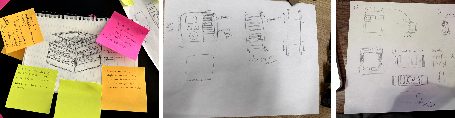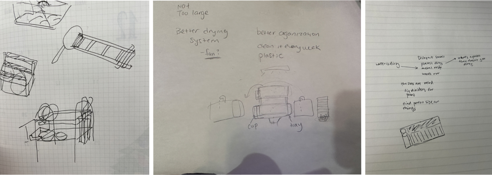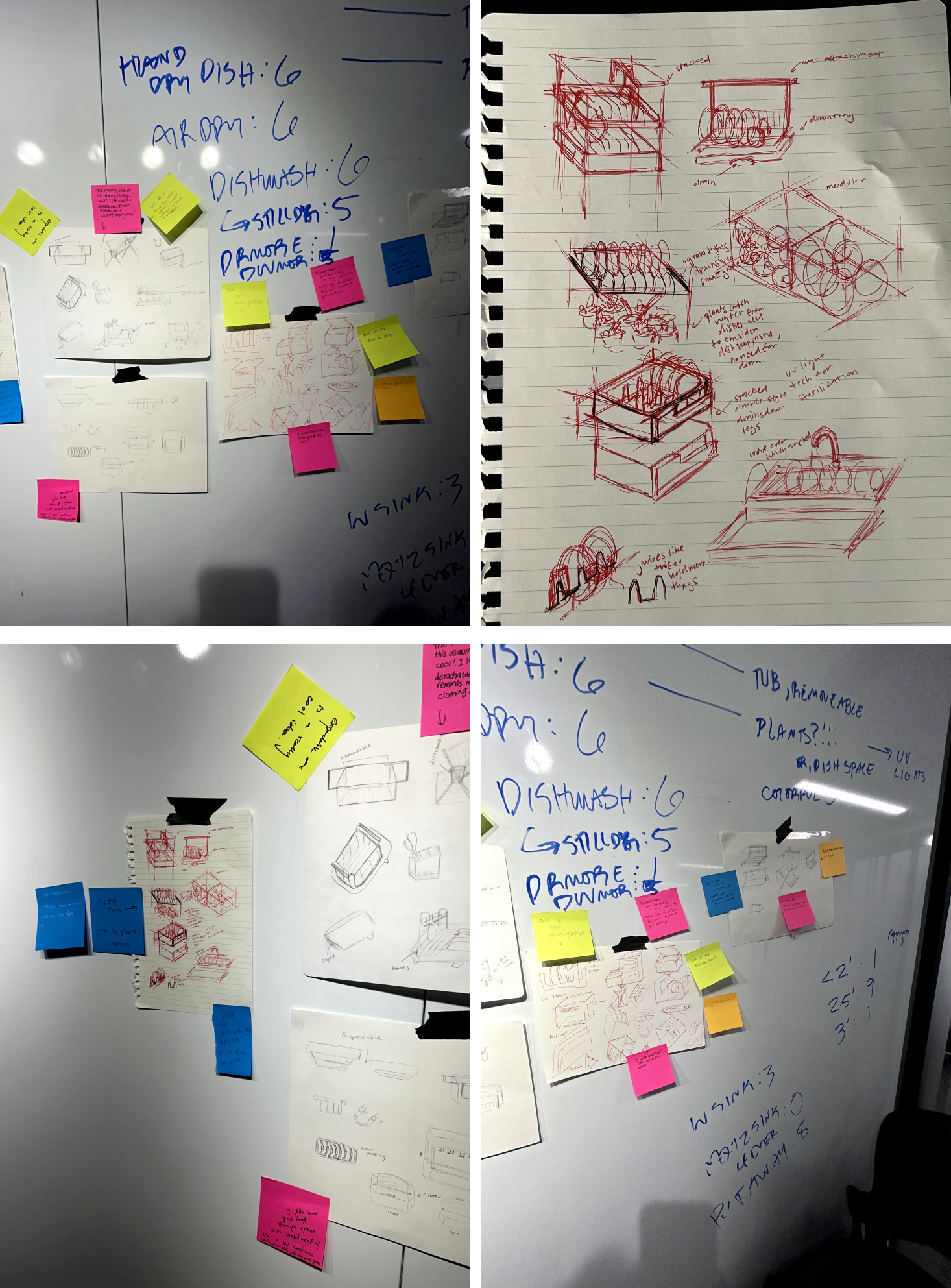 Each group member sketched 9 dishrack prototypes just to get ideas out. Then we solicited feedback from our peers in the class to figure out what they liked and disliked from each design.