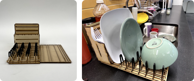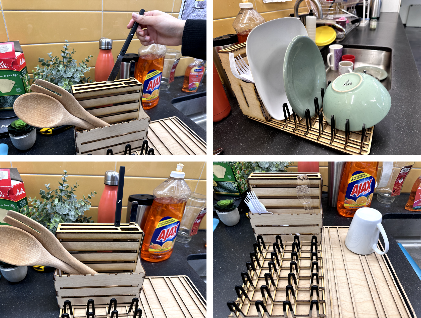 Our final few prototypes were all created with a laser cutter with an Adobe Illustrator design, focusing on experimenting with different mat, dishrack, and utensil box sizes. From these iterations, we learned: