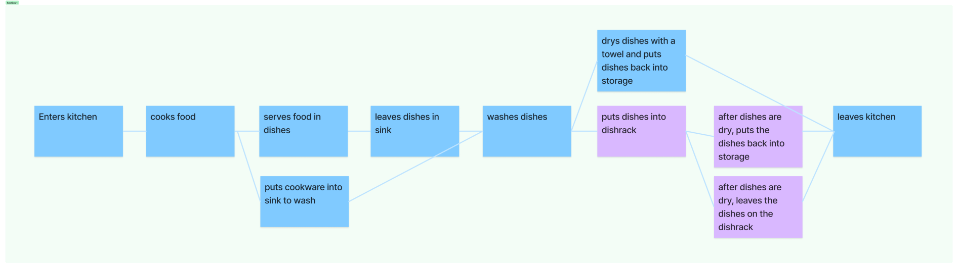 We created a journey map of a typical user cooking a small meal, focusing on how the dishrack impacts the overall kitchen experience.