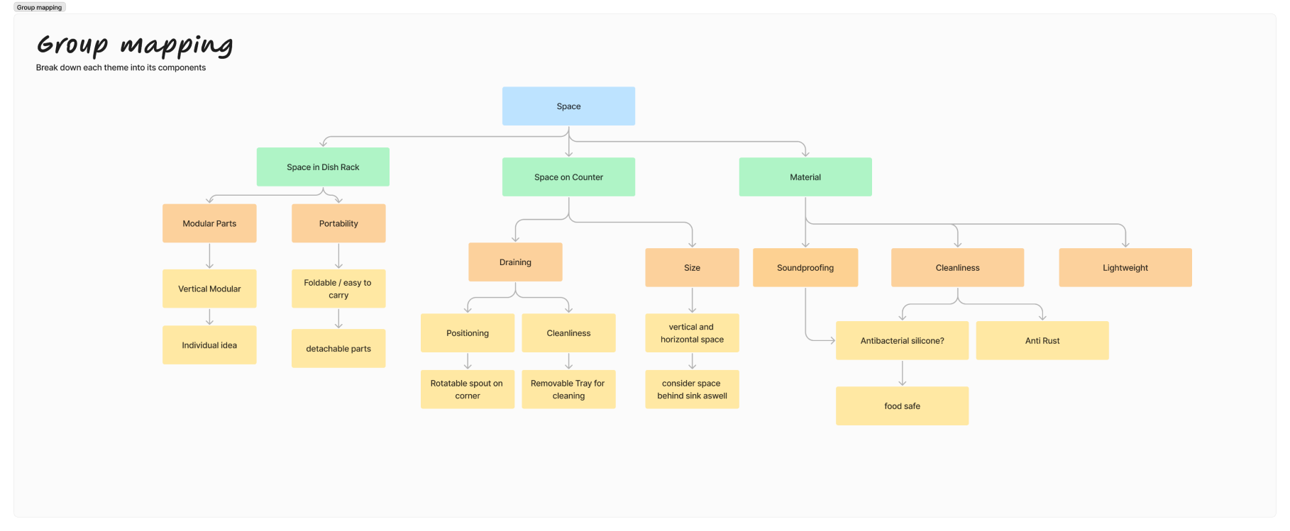 Then we mapped a few of the main concerns to synthesize our interview responses and we found that our goal for this dishrack would be to maximize the usable space inside the dishrack and minimize the space the dishrack takes up on the counter, while creating a design that seamlessly blends with users' kitchens.
